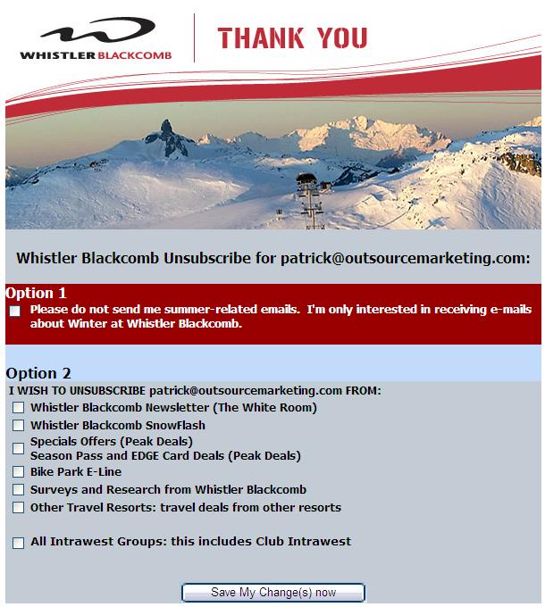 Patrick Byers posts a tricky looking opt-out link from Whistler-Blackcomb. It's tough to tell what you are clicking on, the obvious "opt-out" is a very limited opt-out. In fact, it's not even clear what you should click on if you want to stop receiving additional emails.