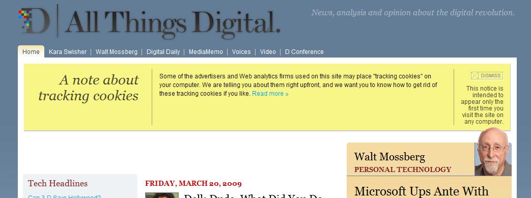 "All Things D" (a tech/business site run by, among others, Kara Swisher and Walt Mossberg - both WSJ reporters) put in place a practice that's pretty non-intrusive, and which alerts readers that the site - like 90% of the websites with advertising on them - uses cookies to collect information. Check out the screenshots below: