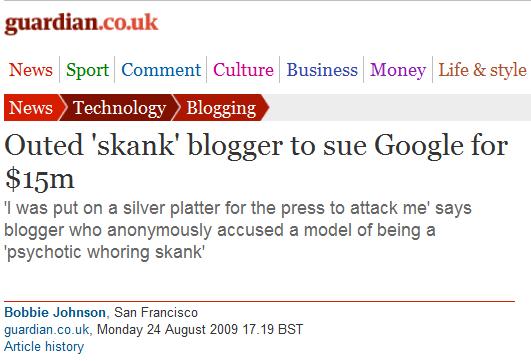 Seriously, the basic story of this thing that spiraled out of control and became a media event is that someone created a blog called "Skanks in NYC" on Google's blogger platform. Anonymously. The blog contained some nasty things about model Liskula Cohen. Ms. Cohen sued, or more accurately, sought "pre-action discovery" in New York. The author (Rosemary Port) contested the discovery, which sought the identity of the author. A judge in New York found the posts to be sufficiently nasty to allow the discovery. Next thing you know, the author (Ms. Port) says she's going to sue Google for revealing her identity. This should have been dismissed out of hand as mere ranting, but instead brought about a flurry of reports which actually speculated as to the merits of the author's claims. As Ben Sheffner notes at his blog here, those claims have little or no chance of success.