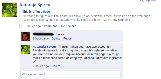 Here's the scenario: I have a personal page on Facebook which I've had for the past year or so (give or take). About six months ago I decided to set up a "company page" for a side-project I'm working on with my mom (selling Indian spice mixes and rubs). Here's a link to the spice mix page. (At the risk of sounding trite, and to use an over-used expression, "feel free to fan" the spice rub page [link].) The basic problem I have is that Facebook does not make it easy to disassociate my personal page from the company page. My recollection when I set up the company page was that you had to tie it to a personal page for the person who would be the administrator. This was a lame decision on Facebook's part. Maybe people want to set up a company page but they don't want to be "on Facebook" (personally)? Anyway, that's neither here nor there, but what I'm really having trouble figuring out is how to easily distinguish between posting to your personal page and and posting to the company page.