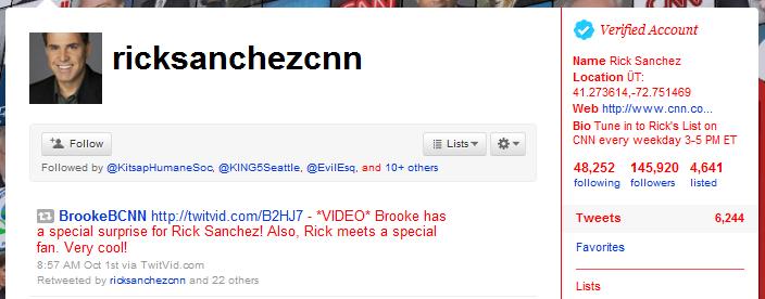 CNN anchor Rich Sanchez was recently fired for some comments he made. Marshall Kirkpatrick (at ReadWriteWeb) asks the question of what happens to his Twitter account: "CNN's Social Media Pioneer Gets Fired: What Happens to Rick Sanchez on Twitter?" An employee's Twitter account may or may not be worth much, depending on who you ask, but Sanchez's departure presents an interesting set of questions.
