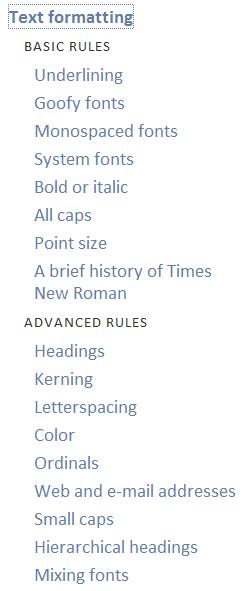 You could literally open the book to any page, read for five minutes, and come away with some helpful information about typography and how it affects a document. You can then easily implement his rules and suggestions. The short book (216 pages, including the foreword and acknowledgments) covers just about every aspect of typography, and its thoroughness will seem daunting, even to those who are tuned in to typography and formatting. For example, here are the rules for text formatting that he covers: