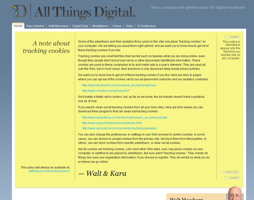 "All Things D" (a tech/business site run by, among others, Kara Swisher and Walt Mossberg - both WSJ reporters) put in place a practice that's pretty non-intrusive, and which alerts readers that the site - like 90% of the websites with advertising on them - uses cookies to collect information. Check out the screenshots below: